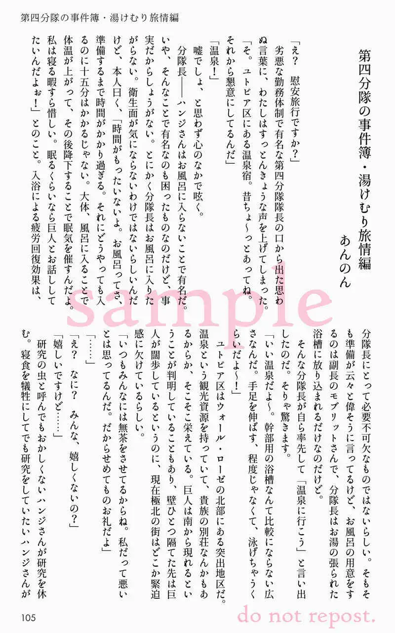 (Dai 33 Kai Hekigai Chousa Haku) [Fuwafuwa Osakana Catch (Usato-chan)] MobHan Onsen Anthology "Yukemuri Roman Kikou" (Shingeki no Kyojin) [Sample]